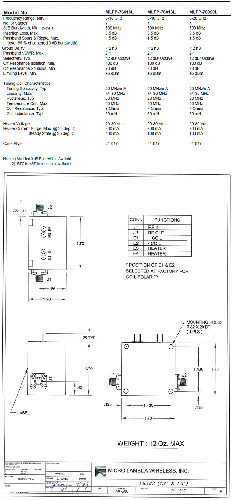 The MICRO LAMBDA MLFP-L Series line of 7-stage YIG bandpass filters provide high selectivity in a low profile 1.7"