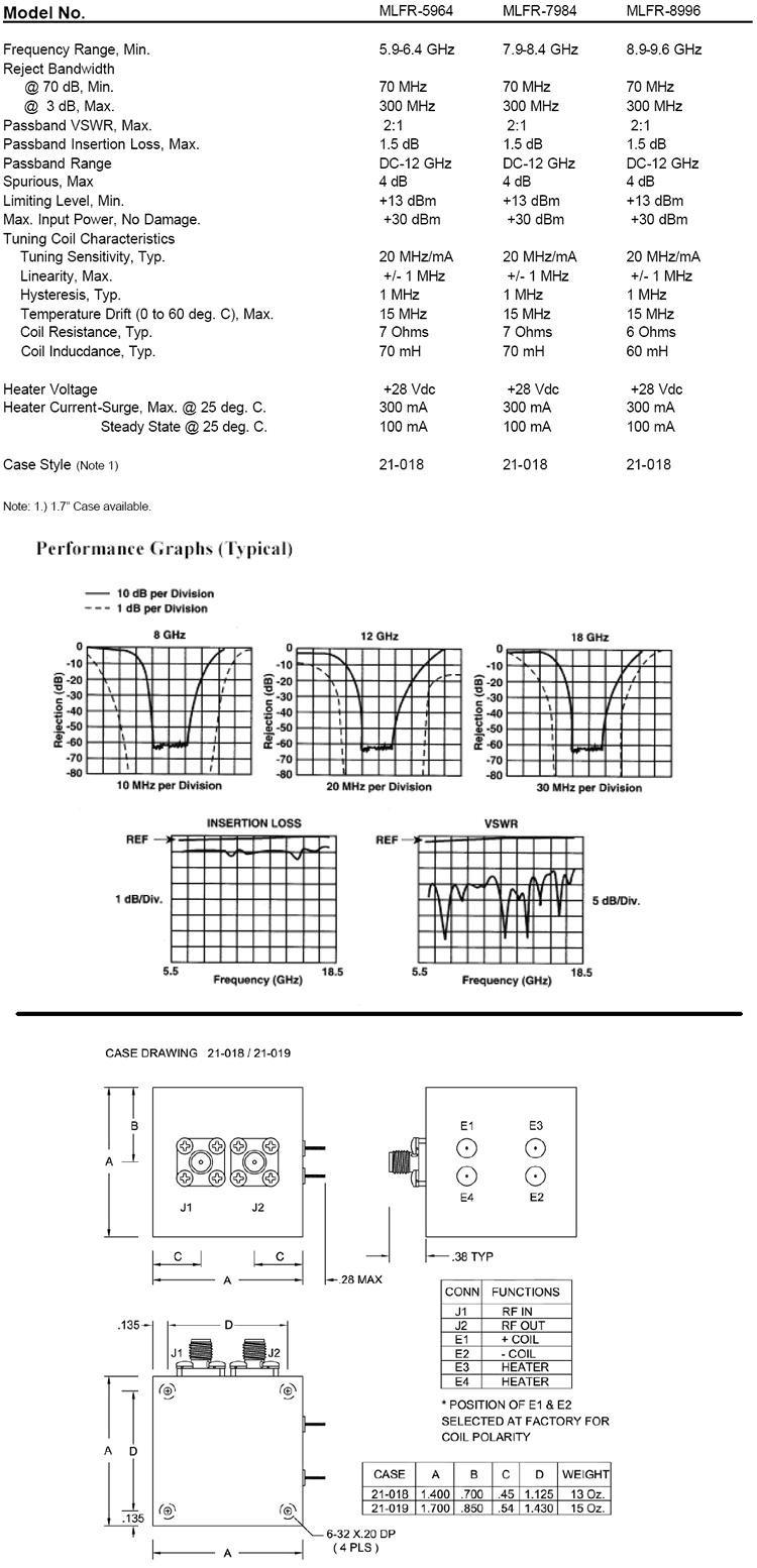 DESCRIPTION The MICRO LAMBDA Ultra Notch Series of Band Reject filters cover the frequency range of 6-12 GHz. These filters offer very deep notch depth and precise bandwidths for rejection of unwanted signals. Standard frequency bands of 5.9-6.4 GHz, 7.9-8.4 GHz and 8.9-9.6 GHz are provided. 3 dB bandwidths of 300 MHz with 40 dB bandwidths of 70 MHz are available in standard designs. These filters are well suited for broadband receivers and a variety of EW system applications. Standard configuration ELECTRICAL AND PERFORMANCE