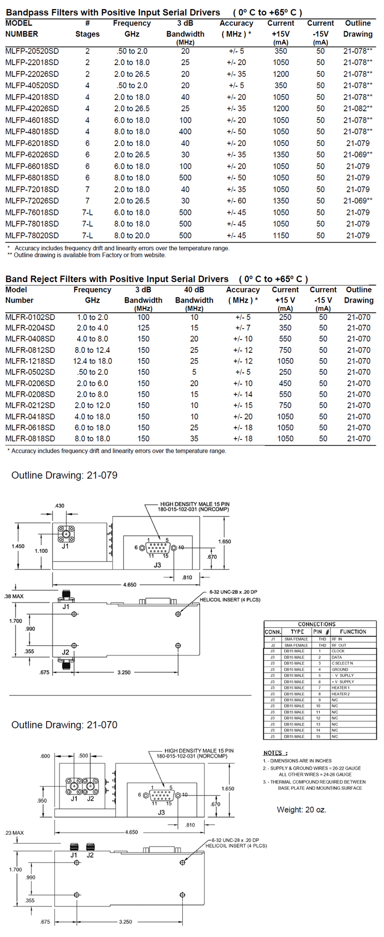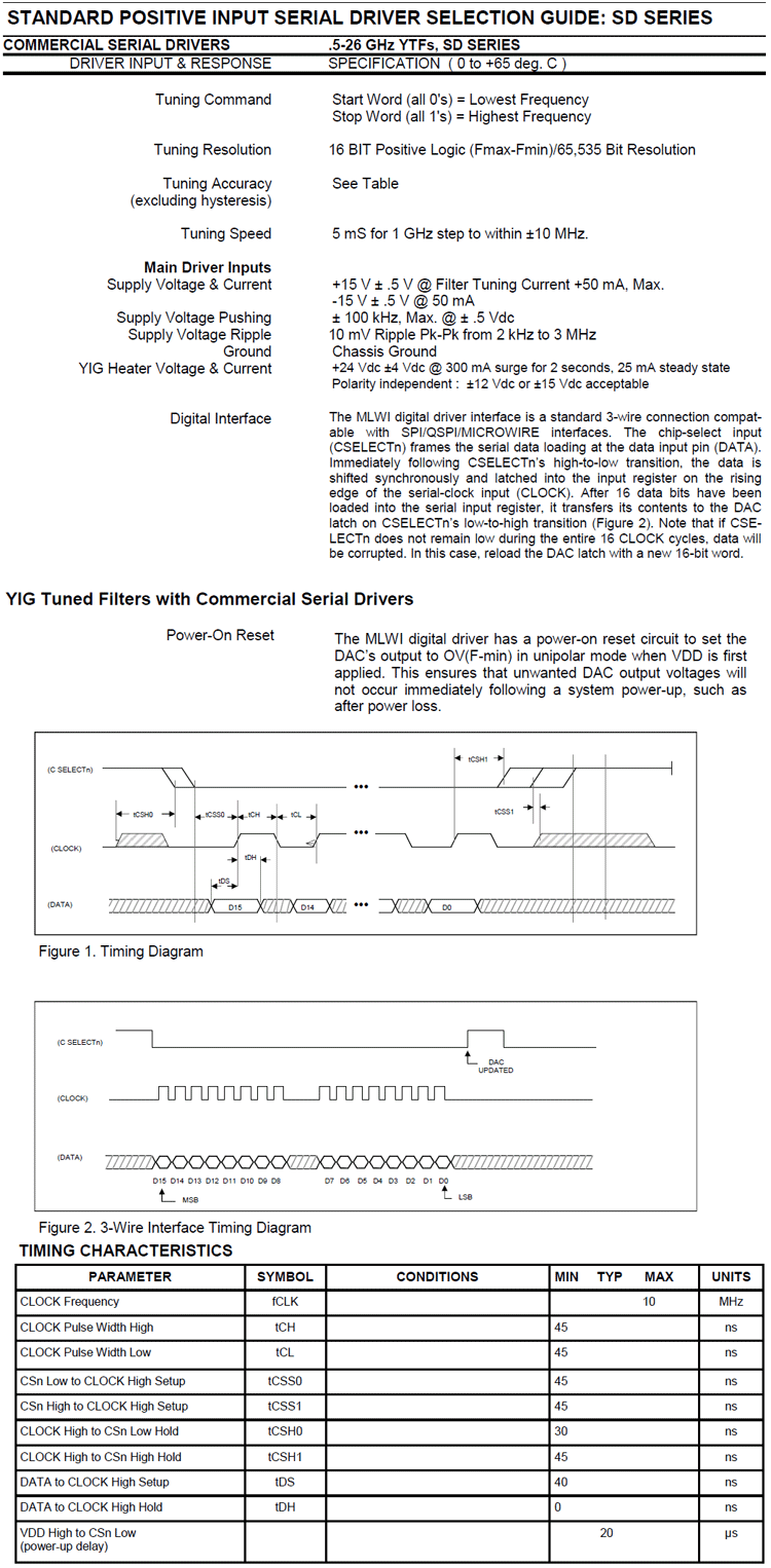 | DESCRIPTION MICRO LAMBDA YIG Filters, model types MLFP Series and MLFR-series are available with integrated serial driver circuits. MICRO LAMBDA drivers eliminate the need for customers to design or develop their own driver circuits and sophisticated test and alignment procedures. Integrating a driver at MICRO LAMBDA’s factory ensures that peak performance will be achieved at the time of manufacture. Alignment and compensation with the particular YIG filter can be maximized down to the component level. All drivers in this series provide input voltage regulators, and compensation circuits to improve frequency drift.
